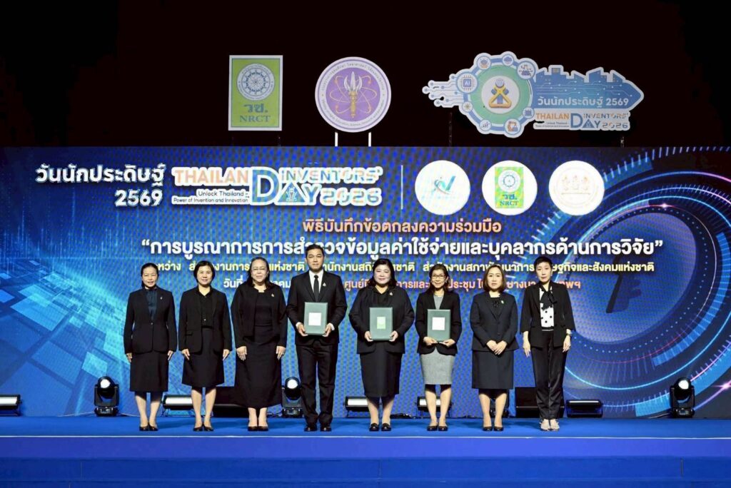 วันที่ 5 มกราคม 2569 สำนักงานการวิจัยแห่งชาติ (วช.) กระทรวงการอุดมศึกษา วิทยาศาสตร์ วิจัยและนวัตกรรม จัดพิธีลงนามบันทึกข้อตกลงความร่วมมือการบูรณาการการสำรวจข้อมูลค่าใช้จ่ายและบุคลากรด้านการวิจัยและพัฒนา (R&D) ร่วมกับ สำนักงานสถิติแห่งชาติ (สสช.) และสำนักงานสภาพัฒนาการเศรษฐกิจและสังคมแห่งชาติ (สศช.) โดยมี ดร.วิภารัตน์ ดีอ่อง ผู้อำนวยการสำนักงานการวิจัยแห่งชาติ ดร. เอกพงษ์ หริ่มเจริญ ผู้อำนวยการสำนักงานสถิติแห่งชาติ นางสาวนภัสชล ทองสมจิตร ที่ปรึกษาด้านนโยบายและแผนงานสำนักงานสภาพัฒนาการเศรษฐกิจและสังคมแห่งชาติ เป็นผู้ลงนาม MOU ซึ่งจัดขึ้นในงาน “วันนักประดิษฐ์ 2569 (Thailand Inventors’ Day 2026) ภายใต้แนวคิด “ปลดล็อกประเทศไทยด้วยพลังของสิ่งประดิษฐ์และนวัตกรรม Unlock Thailand – Power of Invention and Innovation” ณ เวทีกลาง Event Hall 102–103 ศูนย์นิทรรศการและการประชุมไบเทค บางนา กรุงเทพมหานคร