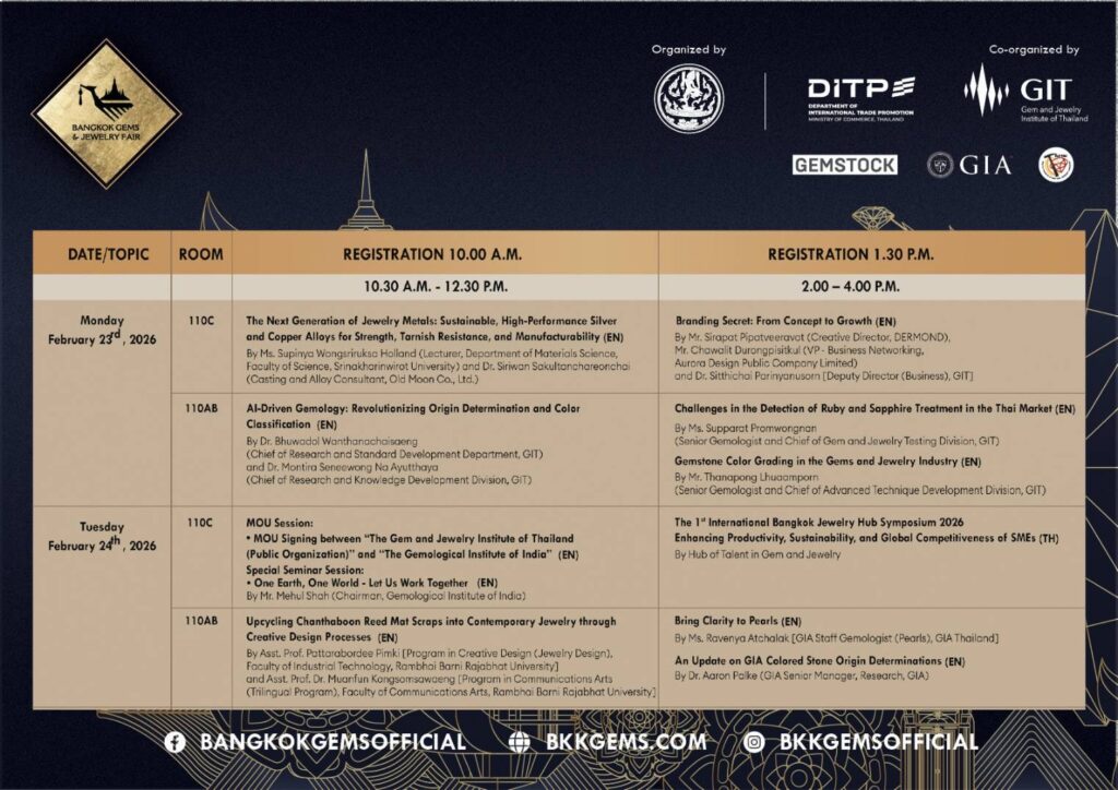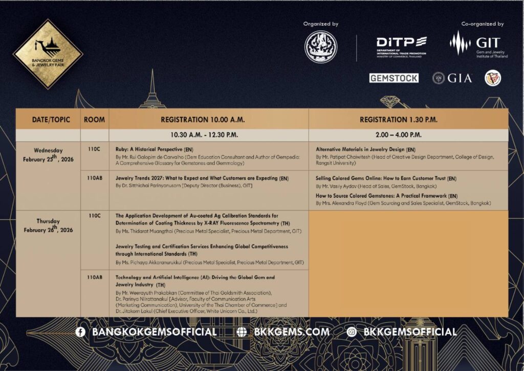 สถาบันวิจัยและพัฒนาอัญมณีและเครื่องประดับแห่งชาติ (องค์การมหาชน) หรือ GIT เตรียมจัดงานสัมมนาวิชาการและเวทีเสวนาระดับนานาชาติ ภายในงาน Bangkok Gems & Jewelry Fair ครั้งที่ 73 ระหว่างวันที่ 23 – 26 กุมภาพันธ์ 2569 ณ ห้อง 110AB และ 110C ชั้น 1 ศูนย์ประชุมแห่งชาติสิริกิติ์ เพื่อยกระดับศักยภาพผู้ประกอบการไทยให้พร้อมแข่งขันในตลาดโลกที่ขับเคลื่อนด้วยเทคโนโลยี นวัตกรรม และมาตรฐานความยั่งยืน