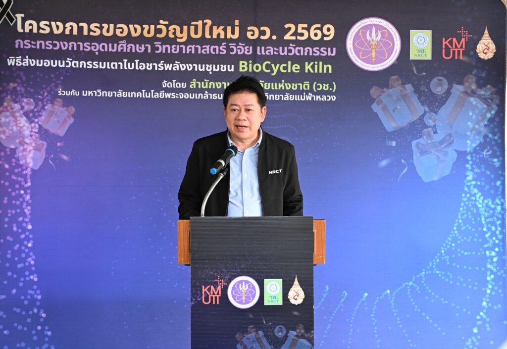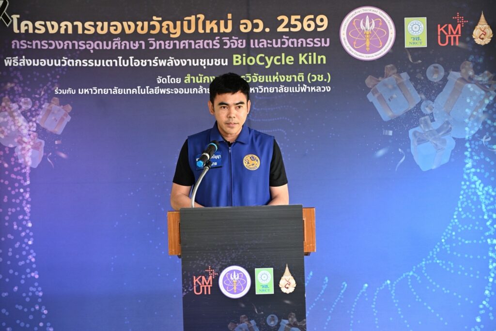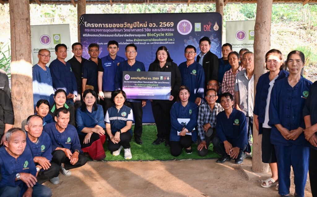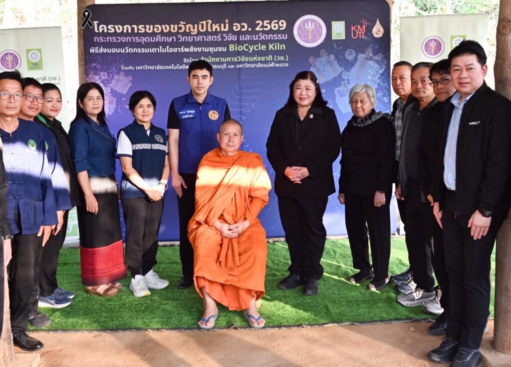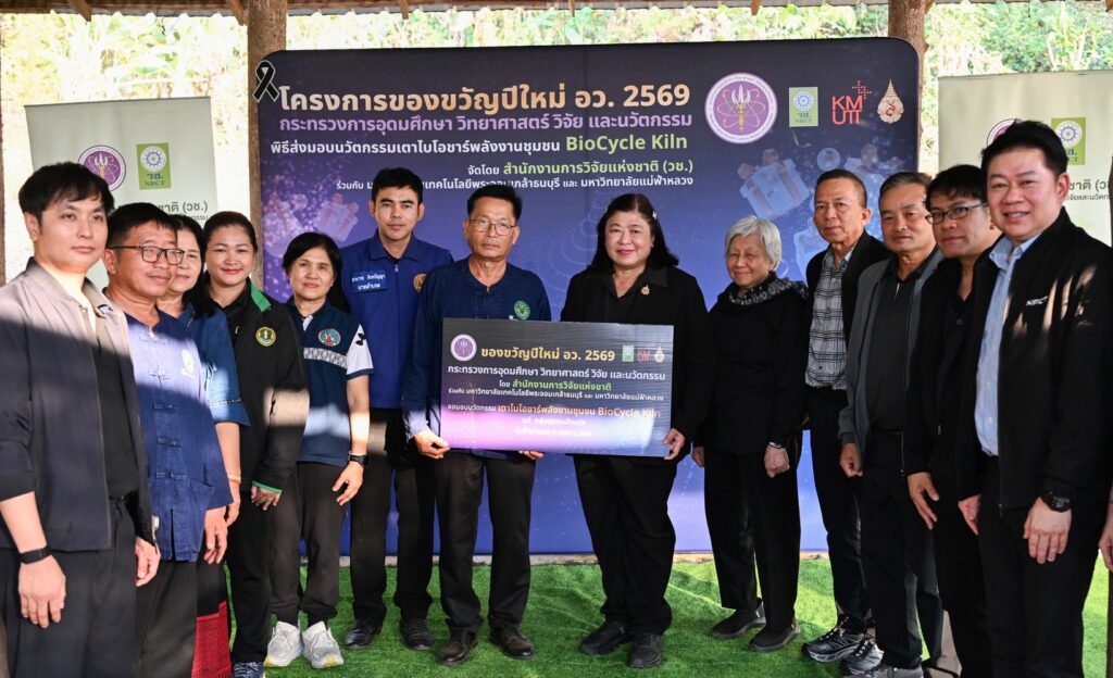 วันที่ 9 กุมภาพันธ์ 2569 สำนักงานการวิจัยแห่งชาติ(วช.) กระทรวงการอุดมศึกษา วิทยาศาสตร์ วิจัยและนวัตกรรม จัด “พิธีส่งมอบนวัตกรรมเตาไบโอชาร์พลังงานชุมชน BioCycle Kiln” ภายใต้โครงการของขวัญปีใหม่ อว. 2569 โดยมี ดร.วิภารัตน์ ดีอ่อง ผู้อำนวยการสำนักงานการวิจัยแห่งชาติ เป็นประธาน พร้อมด้วย รองศาสตราจารย์ ดร.อนรรฆ ขันธะชวนะ หัวหน้าโครงการ กล่าวรายงาน, นายสามารถ อินทปัญญา นายอำเภอลอง กล่าวต้อนรับ พระครูสิริสุเมธากร เจ้าคณะอำเภอลอง เจ้าอาวาสวัดบ้านปง จ.แพร่ และคณะผู้ทรงคุณวุฒิ วช. เข้าร่วมพิธี ณ กลุ่มชุมชนบ้านปง ต.ต้าผามอก อ.ลอง จังหวัดแพร่