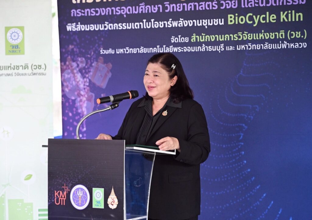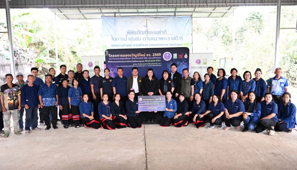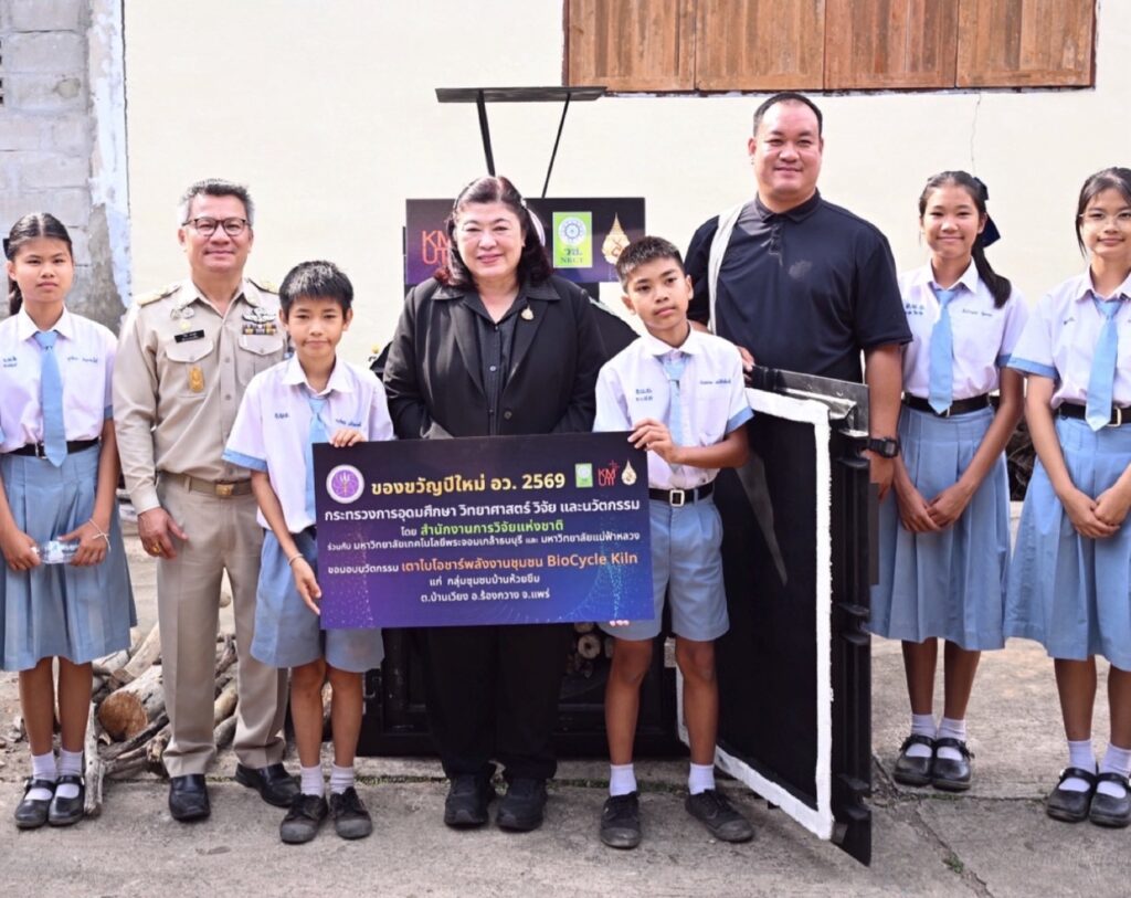 วันที่ 9 กุมภาพันธ์ 2569 สำนักงานการวิจัยแห่งชาติ(วช.) กระทรวงการอุดมศึกษา วิทยาศาสตร์ วิจัยและนวัตกรรมจัด “พิธีส่งมอบนวัตกรรมเตาไบโอชาร์พลังงานชุมชน BioCycle Kiln” ภายใต้โครงการของขวัญปีใหม่ อว. 2569 โดยมี ดร.วิภารัตน์ ดีอ่อง ผู้อำนวยการสำนักงานการวิจัยแห่งชาติ เป็นประธานในการส่งมอบ พร้อมด้วย รองศาสตราจารย์ ดร.อนรรฆ ขันธะชวนะ มหาวิทยาลัยเทคโนโลยีพระจอมเกล้าธนบุรีหัวหน้าโครงการ กล่าวรายงาน นายธนรัตน์ แปงใจ ผู้อำนวยการสำนักจัดการทรัพยากรป่าไม้ที่ 3 สาขาแพร่ กล่าวต้อนรับ และคณะผู้ทรงคุณวุฒิ วช. เข้าร่วมพิธี ณ บ้านห้วยขึม ต.น้ำเลา อ.ร้องกวาง จ.แพร่