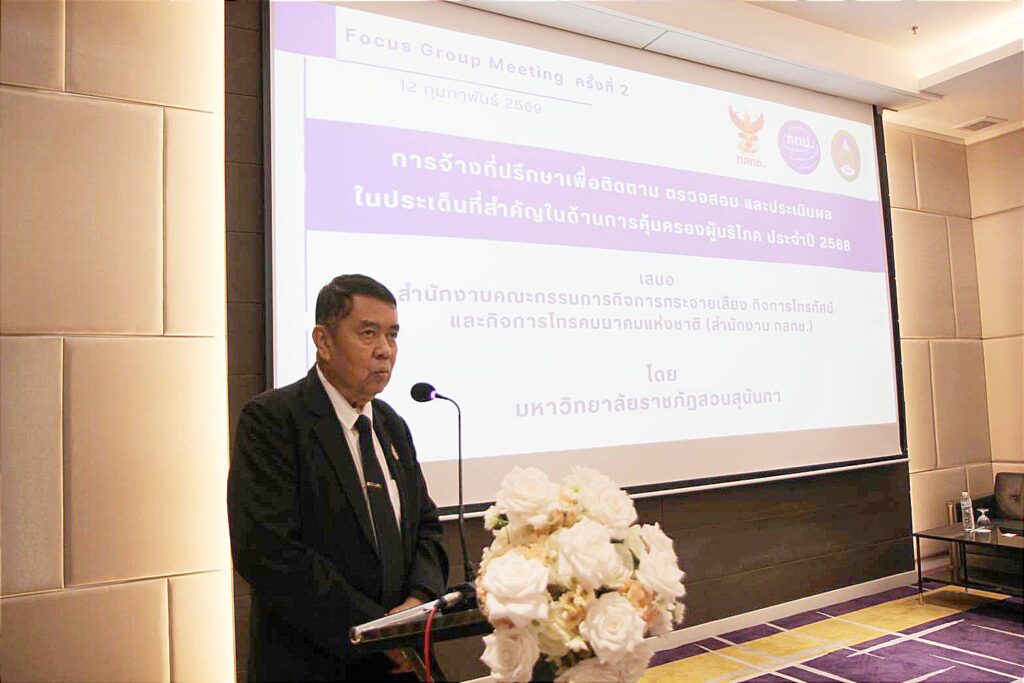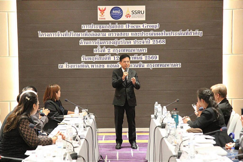 มหาวิทยาลัยราชภัฏสวนสุนันทา ประสบความสำเร็จในการดำเนินบทบาทที่ปรึกษาเชิงรุกในโครงการติดตาม ตรวจสอบ และประเมินผลการปฏิบัติงานด้านการคุ้มครองผู้บริโภค ประจำปี 2568 โดยล่าสุดได้จัดกิจกรรมประชุมกลุ่มย่อยหรือ Focus Group ครั้งที่ 2 เมื่อวันพฤหัสบดีที่ 12 กุมภาพันธ์ 2569 ณ ห้องไอวี่ 4 โรงแรมทีเค พาเลซ แอนด์ คอนเวนชั่น แจ้งวัฒนะ โดยมี รศ.(พิเศษ) พล.ต.ท.ดร.ณรงค์ กุลนิเทศ ประธานหลักสูตรปรัชญาดุษฎีบัณฑิต และวิทยาศาสตรมหาบัณฑิต สาขาวิชานิติวิทยาศาสตร์ มหาวิทยาลัยราชภัฏสวนสุนันทา ในฐานะหัวหน้าโครงการ เป็นผู้ขับเคลื่อนหลักในการรวบรวมข้อมูลและเสียงสะท้อนจากภาคส่วนที่เกี่ยวข้อง เพื่อนำมาพัฒนาเป็นแนวทางปฏิบัติที่ชัดเจน ซึ่งภายในงานได้รับเกียรติจาก พลเอกสิทธิชัย มากกุญชร กรรมการติดตามและประเมินผลการปฏิบัติงาน (กตป.) ด้านการคุ้มครองผู้บริโภค เป็นประธาน พร้อมร่วมรับชมวิดีทัศน์รายละเอียดโครงการที่แสดงให้เห็นถึงวิสัยทัศน์และยุทธศาสตร์สำคัญในการรักษาประโยชน์ของประชาชนในกิจการกระจายเสียง กิจการโทรทัศน์ และกิจการโทรคมนาคม