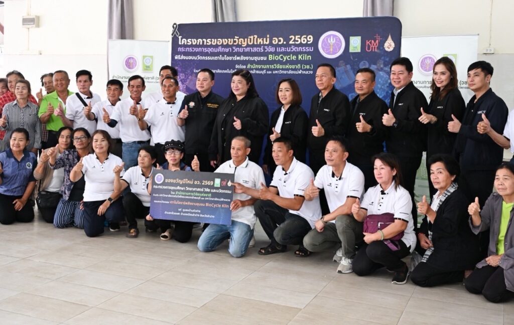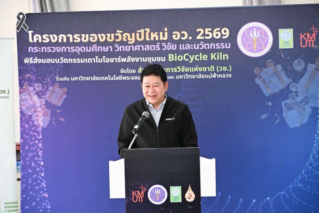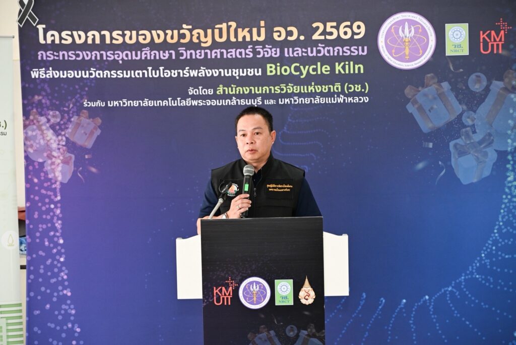 ดร.วิภารัตน์ ดีอ่อง ผู้อำนวยการสำนักงานการวิจัยแห่งชาติ กล่าวว่า นวัตกรรมเตาไบโอชาร์พลังงานชุมชน BioCycle Kiln เป็นผลงานวิจัยที่ วช. ให้การสนับสนุนการพัฒนางานวิจัยและนวัตกรรมแก่มหาวิทยาลัยเทคโนโลยีพระจอมเกล้าธนบุรี ร่วมกับมหาวิทยาลัยแม่ฟ้าหลวง โดยนำองค์ความรู้จากงานวิจัยมาพัฒนาต่อยอดสู่การใช้ประโยชน์จริงในการจัดการเศษวัสดุเหลือทิ้งทางการเกษตรอย่างมีประสิทธิภาพ โดยมีเป้าหมายเพื่อเป็นกลไกสนับสนุนการแก้ไขปัญหาฝุ่นละออง PM2.5 และลดการเผาในภาคการเกษตร ครอบคลุมพื้นที่ 8 จังหวัดภาคเหนือ สะท้อนบทบาทของงานวิจัยและนวัตกรรมในการขับเคลื่อนการพัฒนาชุมชน และยกระดับคุณภาพชีวิตของประชาชนในพื้นที่